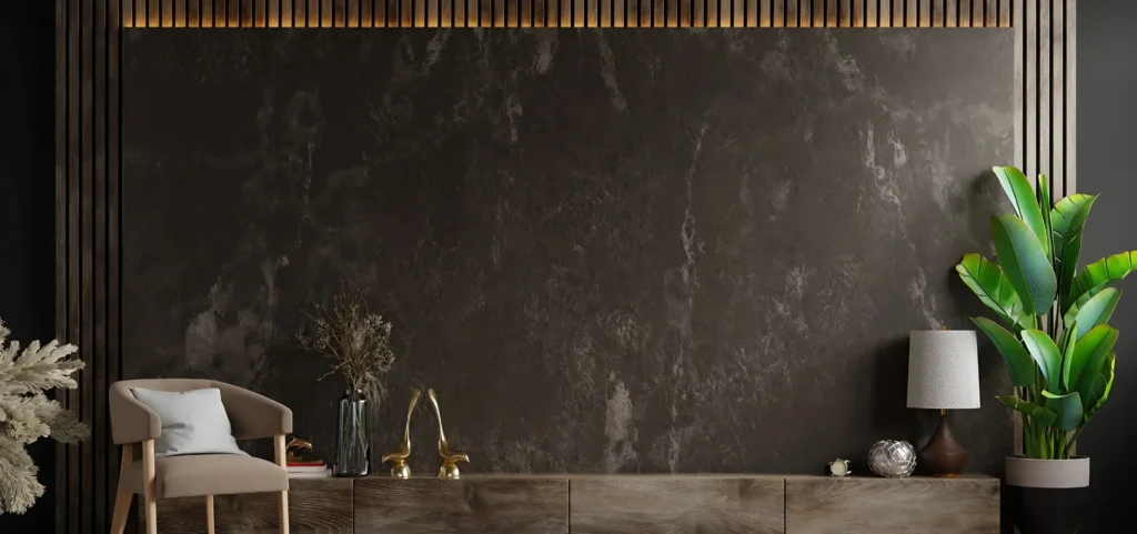 Start with a sophisticated colour scheme that contrasts neutrals like white, beige, or taupe with rich tones like sapphire or emerald. The velvety matte texture of stone veneer wall panels and the inherent grains of natural veneers are both exquisitely highlighted by these colours.