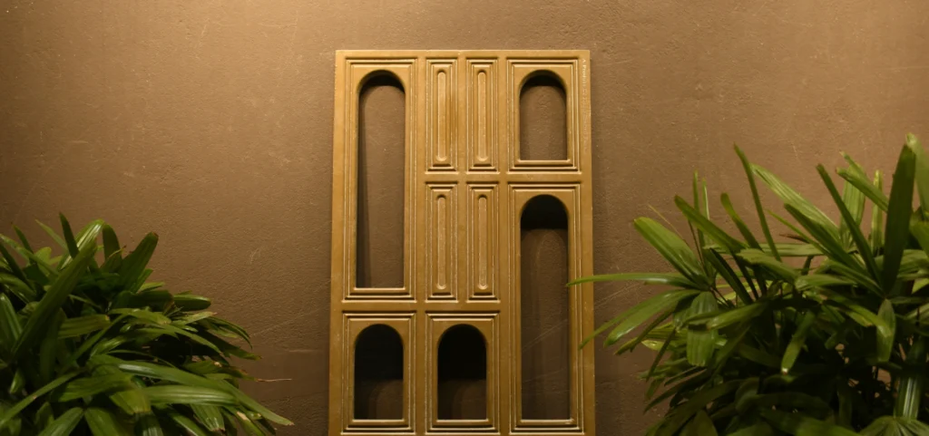 Brass, bronze, or muted gold are examples of metallics that work well with warm-toned fabric designs and Jali Handcrafted Panels to give interior spaces a refined sheen.