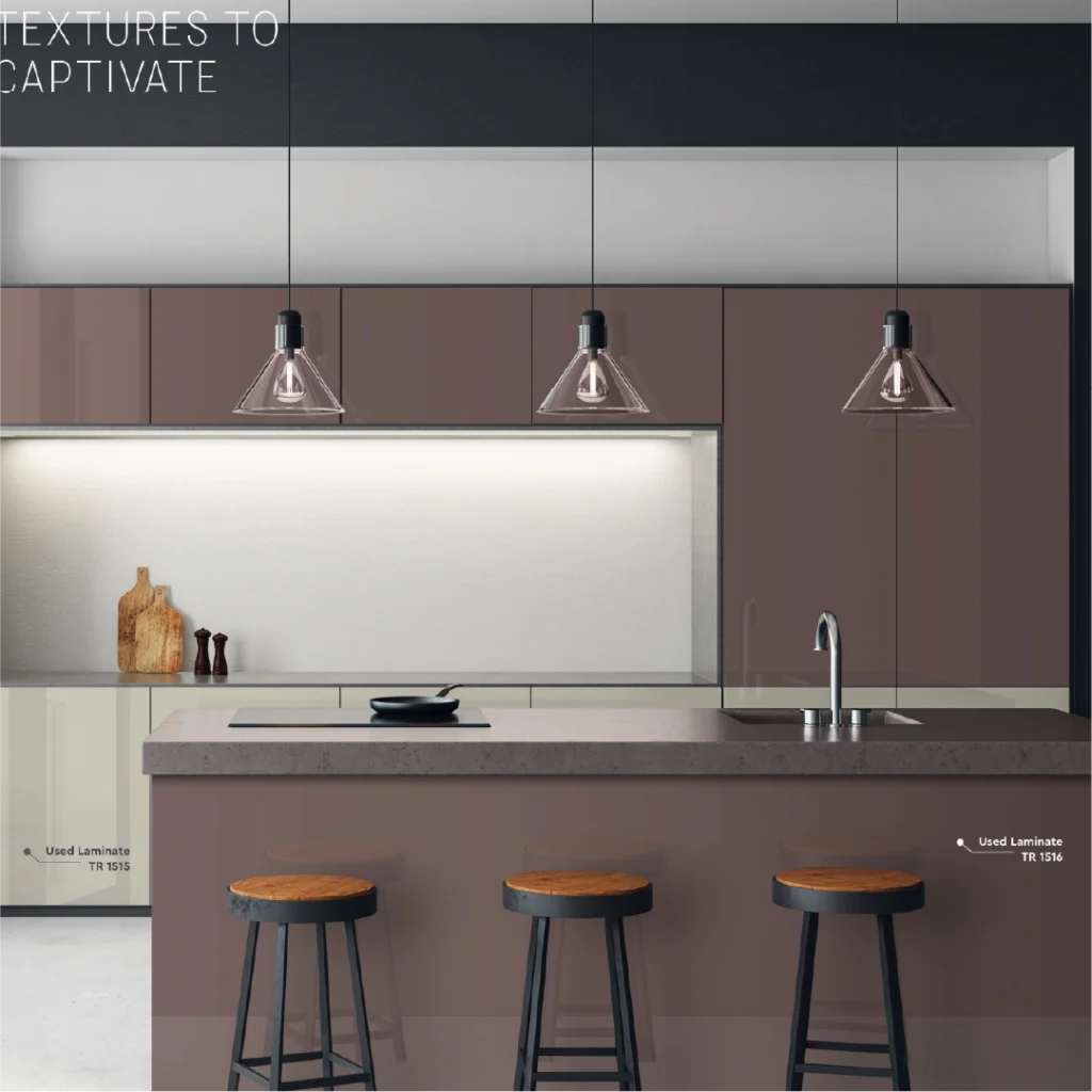 2mm or 8×2 acrylic surfaces for counters provide long-lasting beauty with simple maintenance. The smooth textures and soft hues of acrylic come to life when combined with built-in lighting, producing a warm yet modern atmosphere that perfectly captures the spirit of a modern modular kitchen.