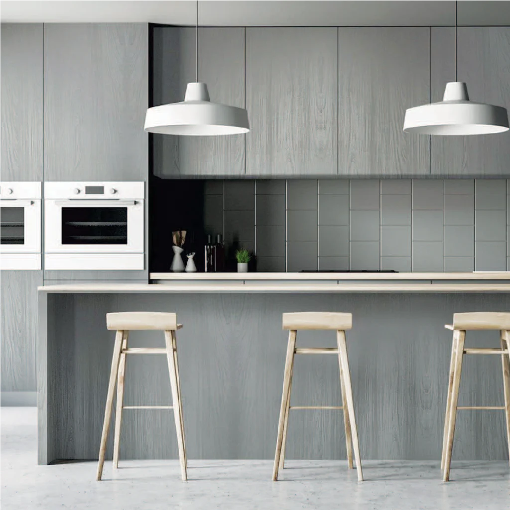 Cooler colours like pale grey or powder blue provide a sharp, contemporary edge, while soft blush cabinets accented with brass evoke classic warmth. For a sleek, reflecting surface that adds depth and light to your kitchen, pair these with matt or 1.5mm acrylic cabinets.