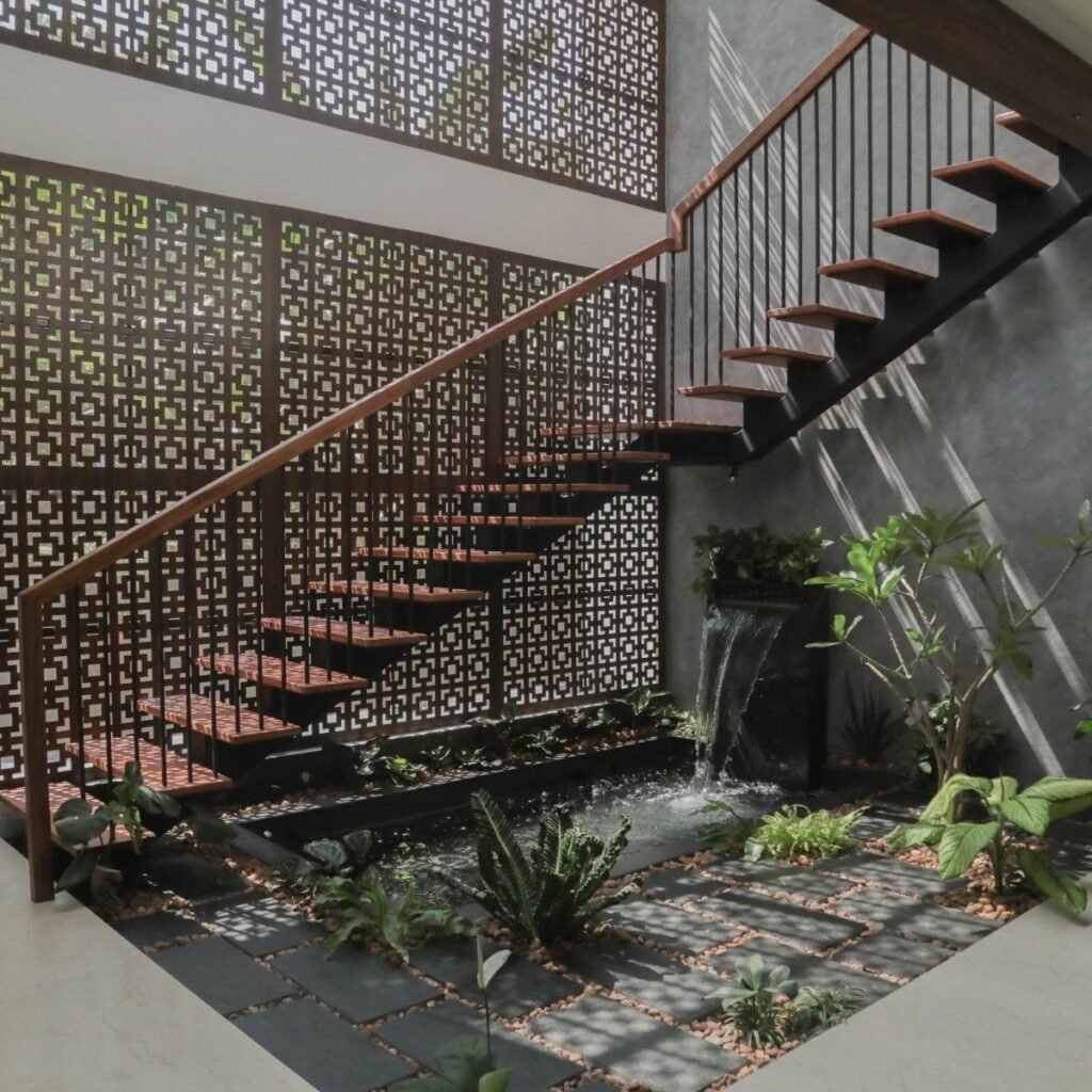 Staircases are often underutilized in design. Installing jali panels along staircase walls can create a dramatic visual feature.