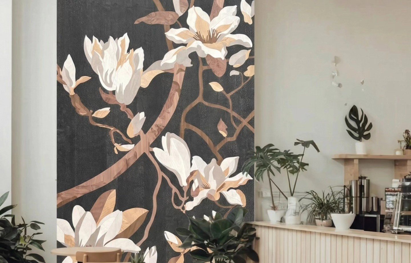 A graceful marquetry of magnolia blossoms flows across...